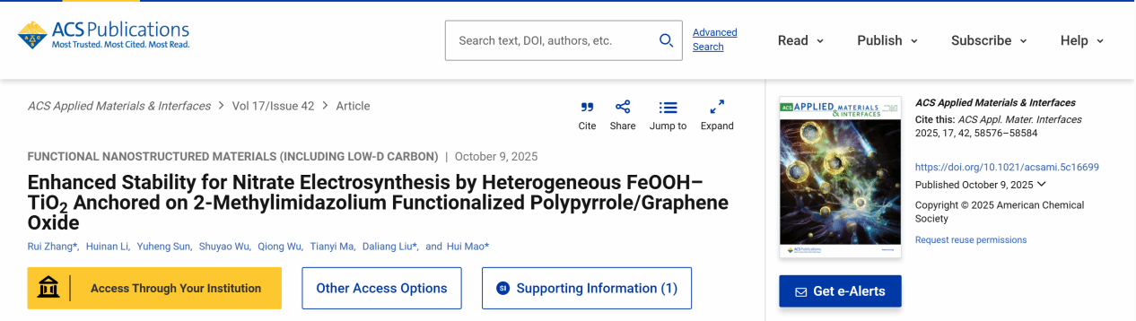 2025年10月,我院张蕊副教授在材料科学二区期刊ACS Applied Materials & Interfaces(IF:8.2)发表题为《Enhanced Stability for Nitrate Electrosynthesis by Heterogeneous FeOOH–TiO2 Anchored on 2-Methylimidazolium Functionalized Polypyrrole/Graphene Oxide》的论文。本研究通过原位生长策略,利用2-甲基咪唑基团与金属前驱体的离子交换和配位作用,将FeOOH–TiO₂异质结构整合到2-MeIm/PPy/GO基底,构建出FeOOH-TiO2@2-MeIm/...